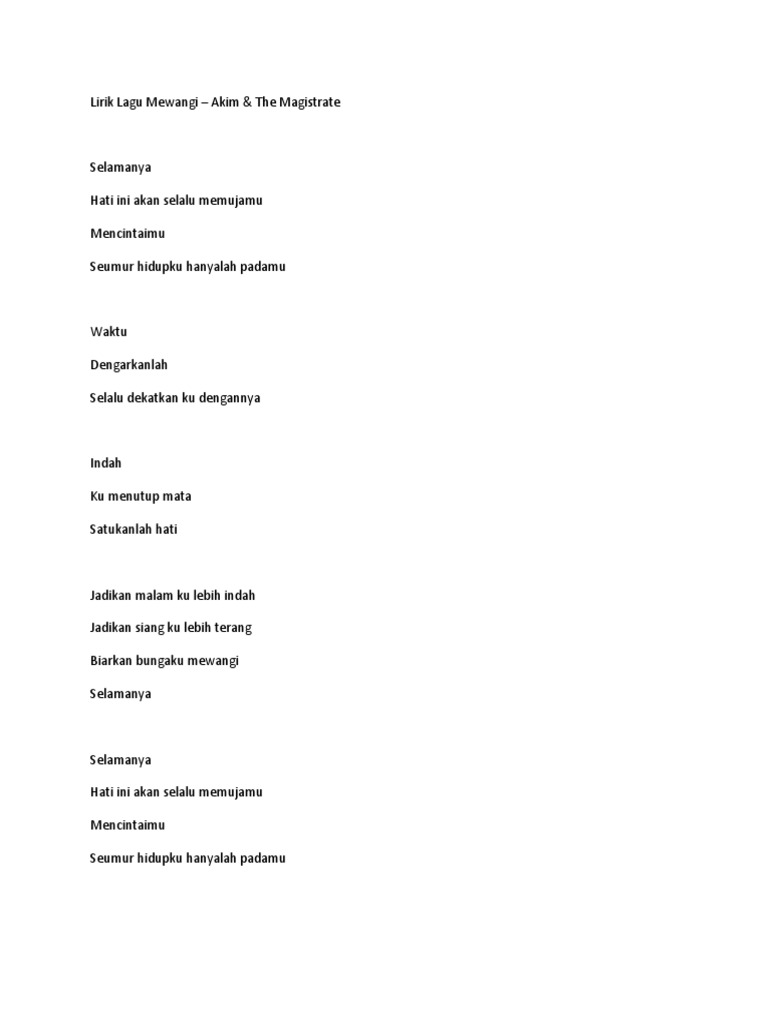 Akim The Magistrate Mewangi Lyrics Chord Capo On 1 Intro A Dm x2 Verses A Selamanya Dm A C D Hati ini akan selalu memujamu A Mencintaimu Dm A C D Adalah dahagaku Dm Waktu A Dengarkanlah Dm A Selalu dekatkan ku dengannya Dm Hingga A Ku menutup mata E Satukanlah hati A Dm Jadikan malam ku lebih indah G C Jadikan. Lirik Lagu Rentak Bahagia Mewangi Selamanya Hati ini akan selalu memujamu Mencintaimu Seumur hidupku hanyalah. Berikut merupakan Lirik Lagu Mewangi - Akim The Magistrate.